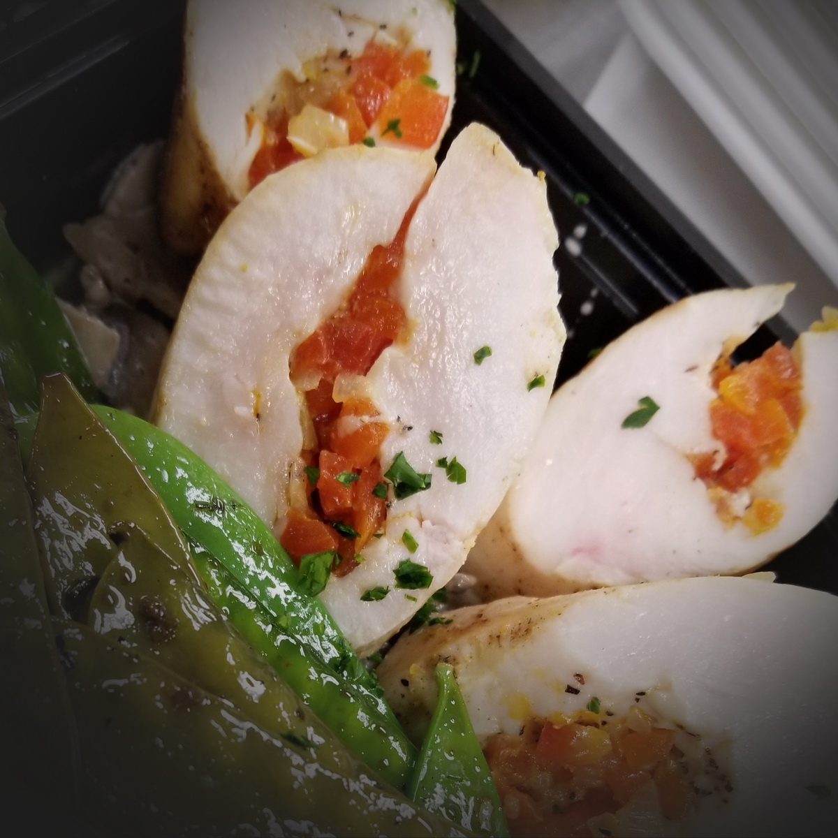poached then sautéed stuffed chicken breast with bell peppers and mushrooms